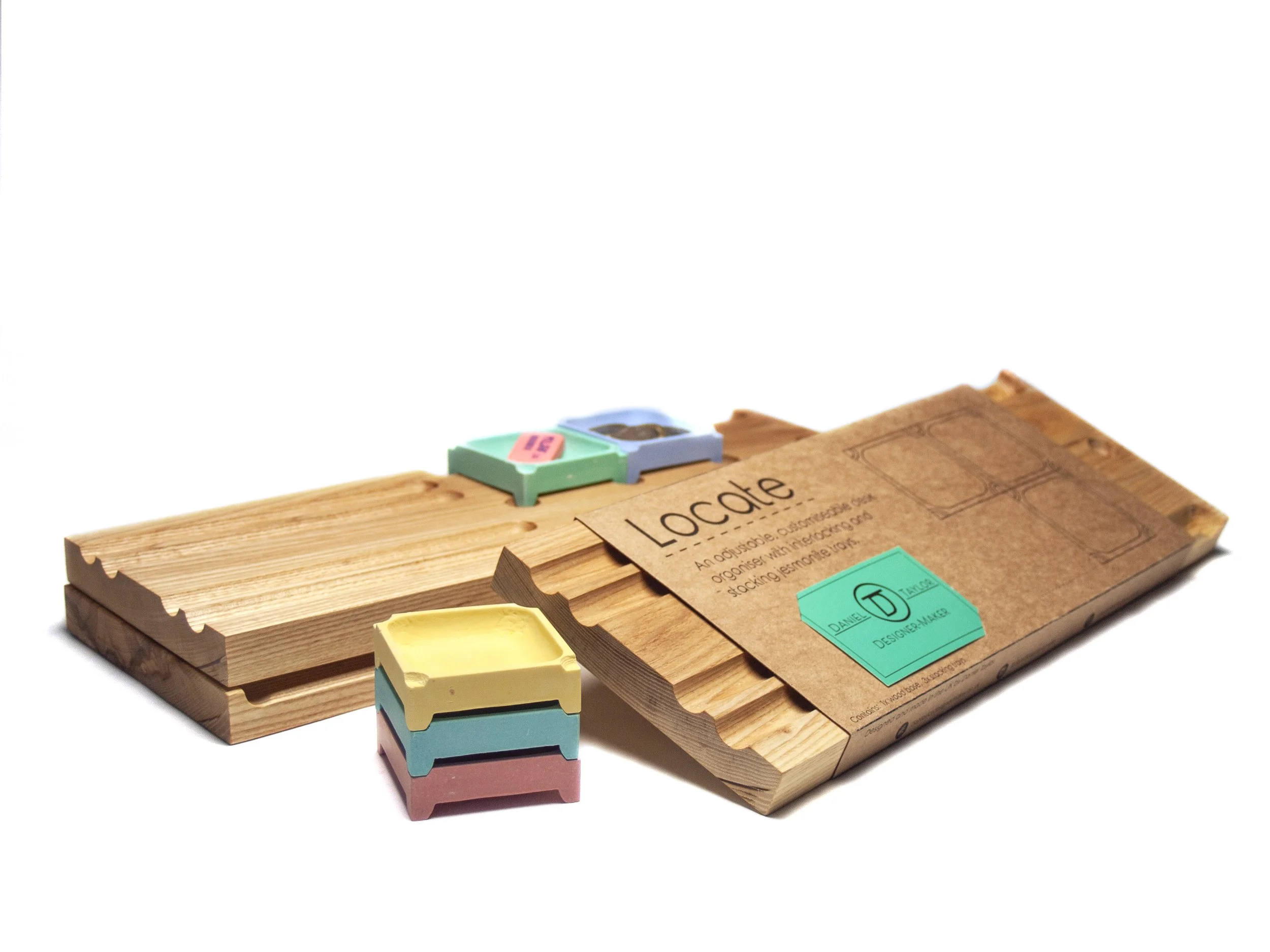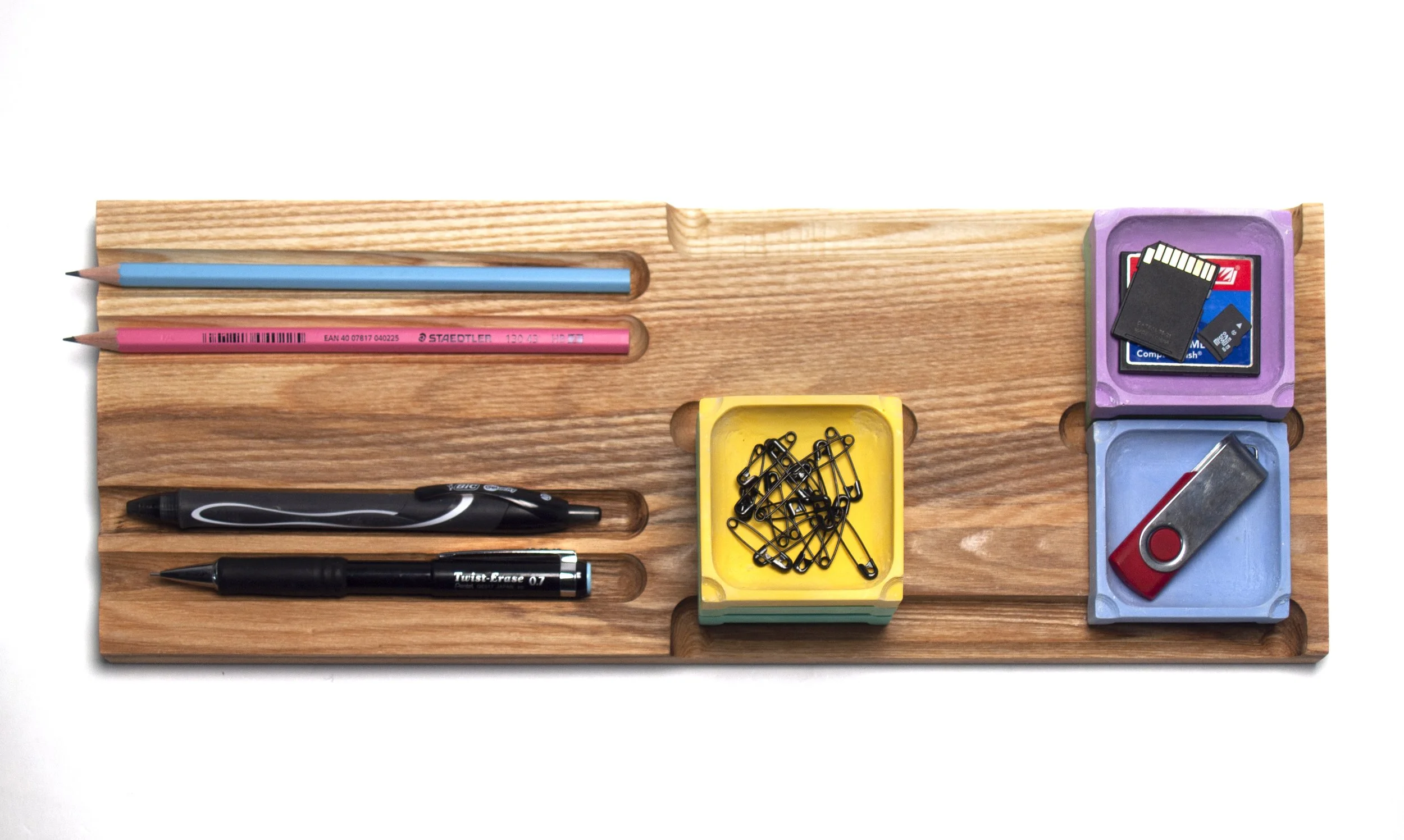 The small cast Jesmonite trays are perfectly sized to hold anything from paperclips to memory sticks, and the quarter-round feet allow the tray to be positioned anywhere in the pegboard lattice.